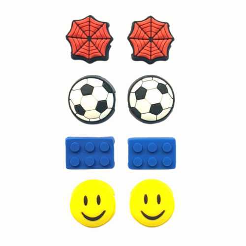 Dette er brillecharms bestående af to spindelvæv, to fodbolde, to blå byggeklodser og to smileys, der kan dekorere brillen.