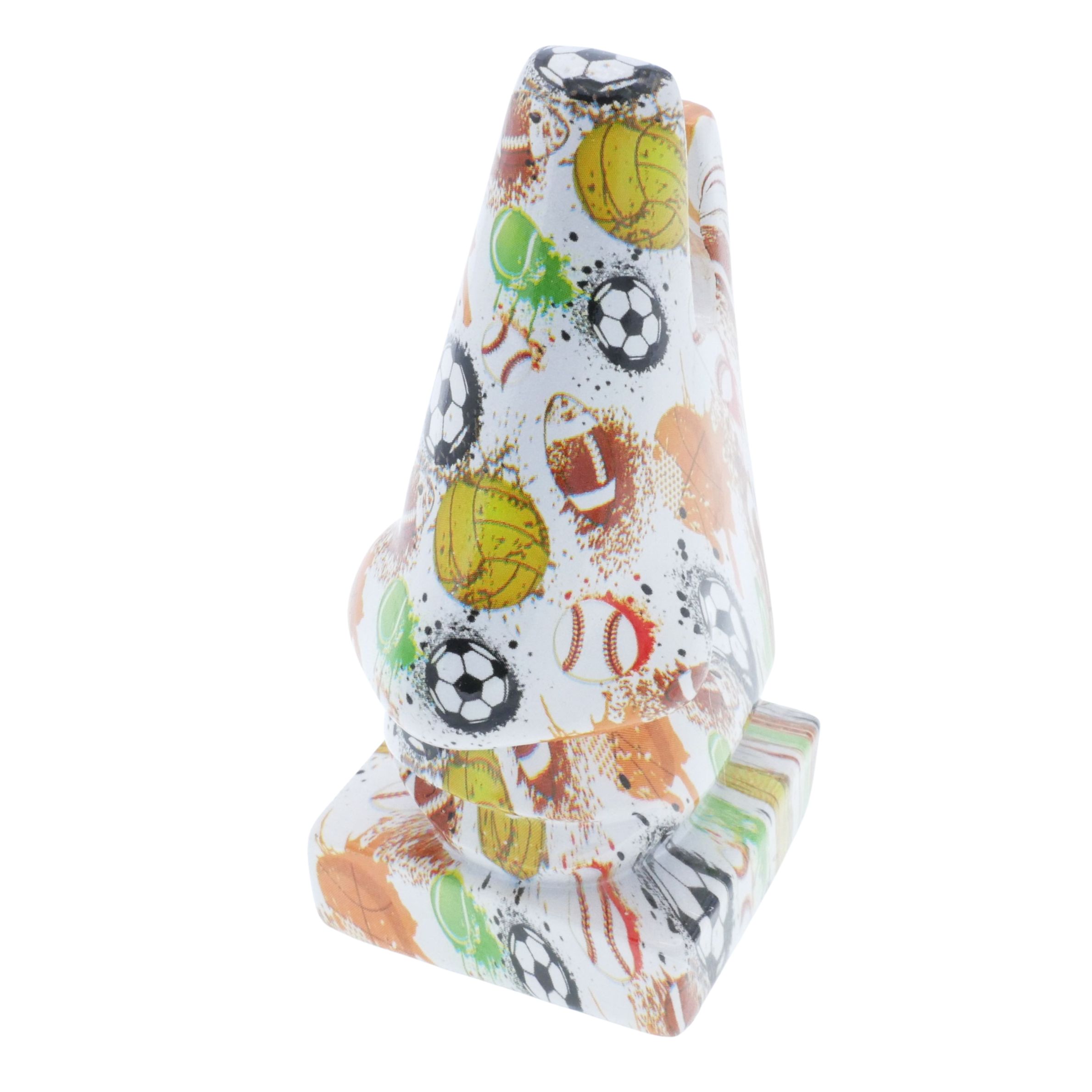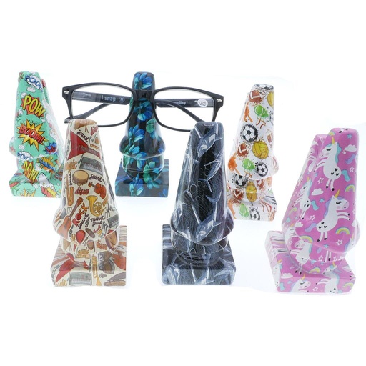 Brilleholderen er formet som en næse, der fungerer som et praktisk og dekorativt stativ. Denne variant har et sporty print.
