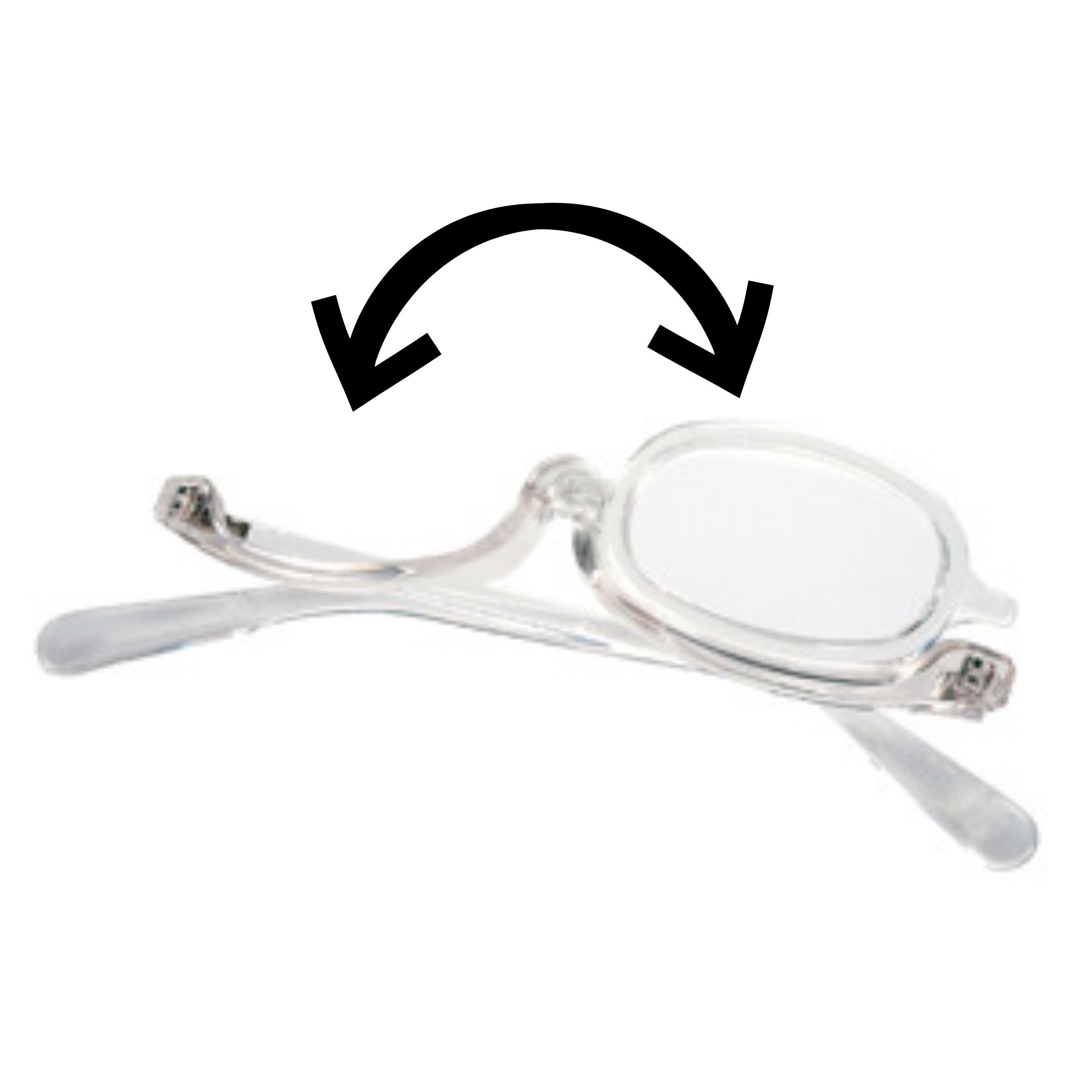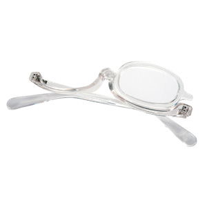 Praktisk makeup-brille med enkelt linseglas, designet til persone, der er langsynede. Den smarte konstruktion gør det muligt at vippe linsen fra det ene øje til det andet – så der er klart syn på det ene øje, mens man kan lægge makeup på det andet.